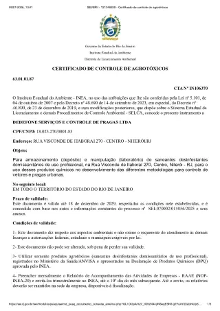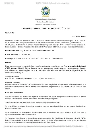 Certificado de controle de agrotóxicos CTA Nº IN106070